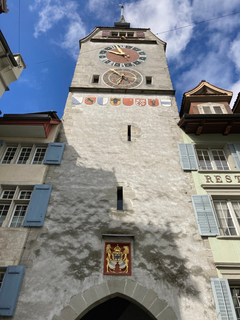 Just around the corner from our hotel is the town’s Clock Tower. The entrance to the old town of Zug was originally a gate in the town’s curtain wall. In the 1300s the gate was strengthened by a protruding D-shaped tower. In 1480, Hans Felder, who also built St. Oswald’s Church (also in Zug) modified the tower, making it the most impressive tower in town. 1n 1557, the tower acquired its current shape with a watch chamber. About twenty years later, the astronomical clock was added. Over the centuries it has been restored and also enhanced for safety. It was struck by lightning in the 1800s so it was given a new pinnacle.