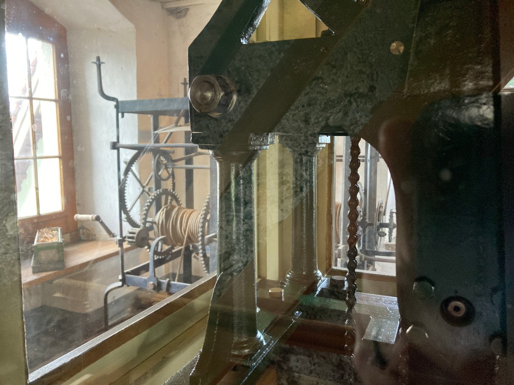 We wandered under the tower (the way it is constructed now, there is an underpass) and noticed a poster about touring the inside of the tower. With a QR code and a smartphone we found out that you could borrow a clocktower key from the shop owner next door. After Ryan handed her his driver’s license, she gave us a key for us to open up the tower. Many sets of wooden open stairs led us to the very top and a great perspective of Zug. Along the way we could see the clock components.