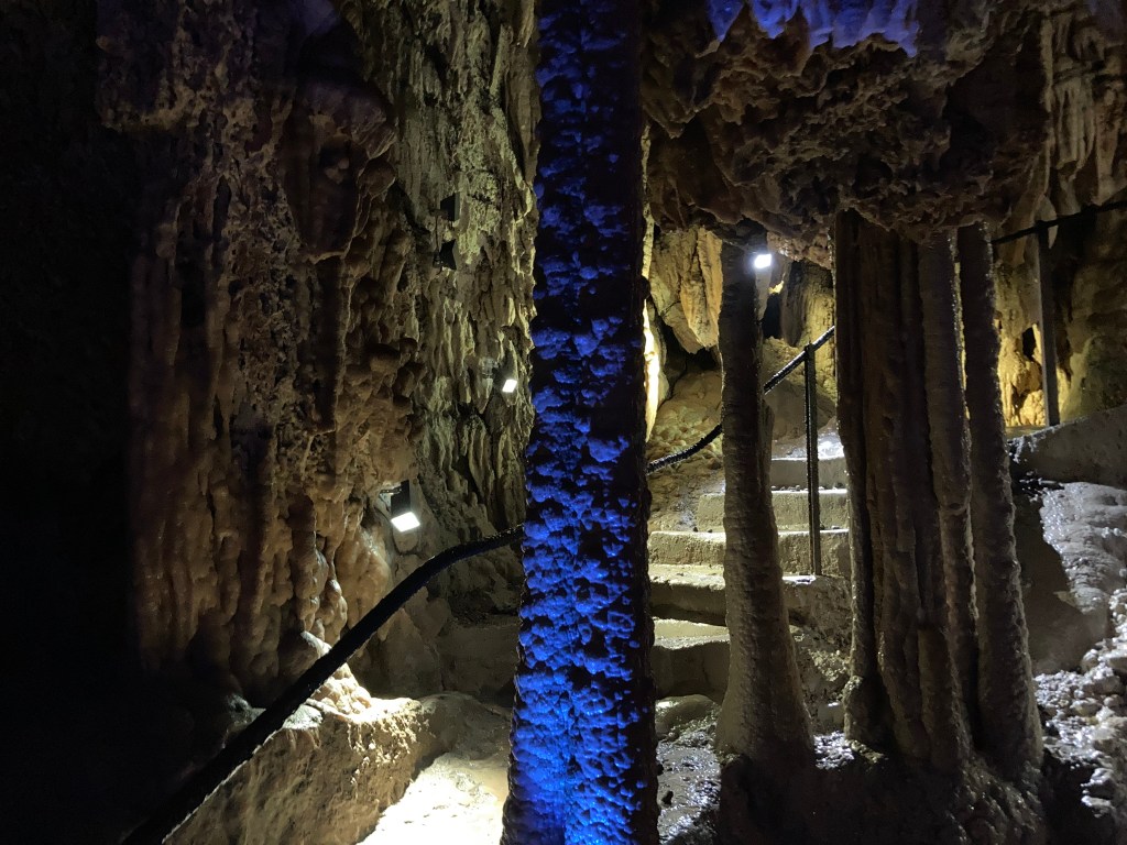 The meandering caves were made extra fun by their use of light and music, along with a mischievous devil spirit graphic called Tüüfeli that appeared in a light show at the last viewpoint. Like the clock tower, it was a self-guided expedition for us. So from great heights to being underground, it was an adventurous day!
