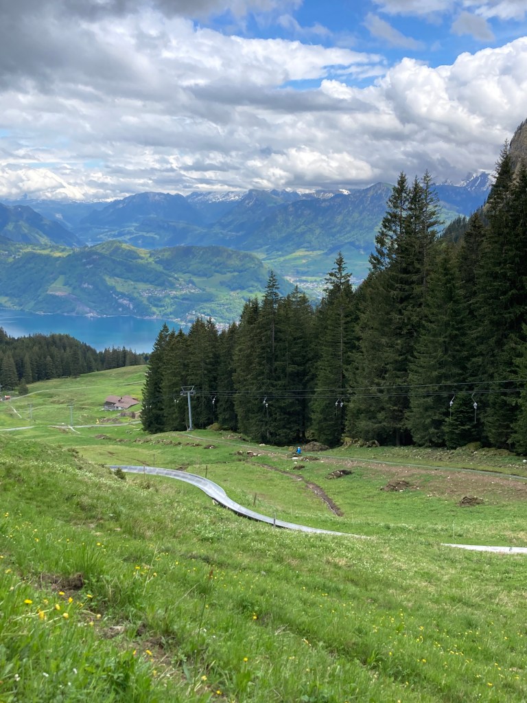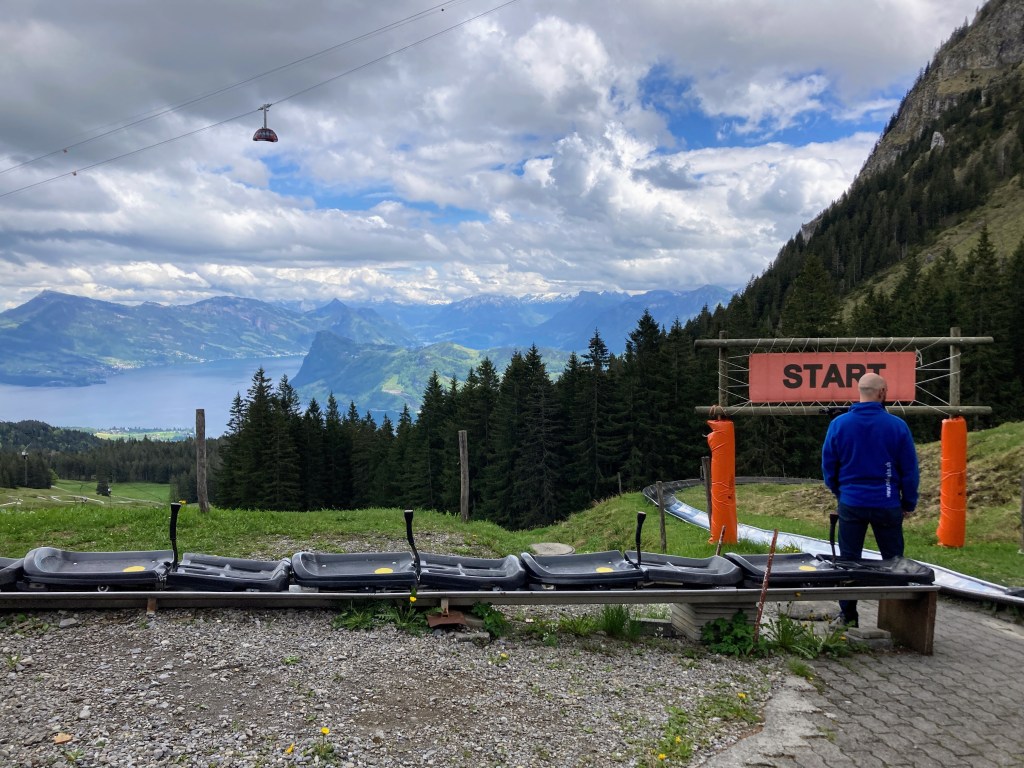 After lunch and many pictures, we exited partway down at Fräkmüntegg (1415 meters altitude) where we all tried our first tobaggan run!