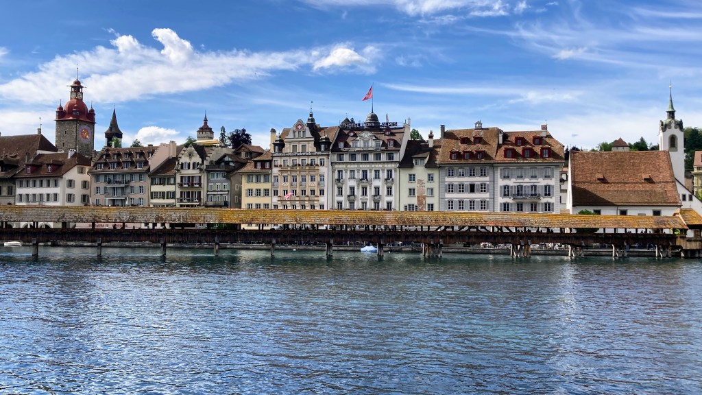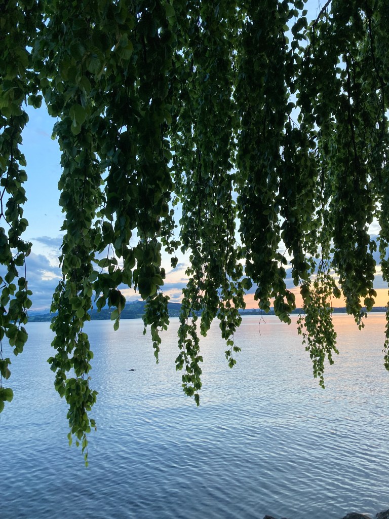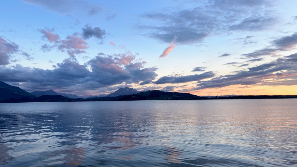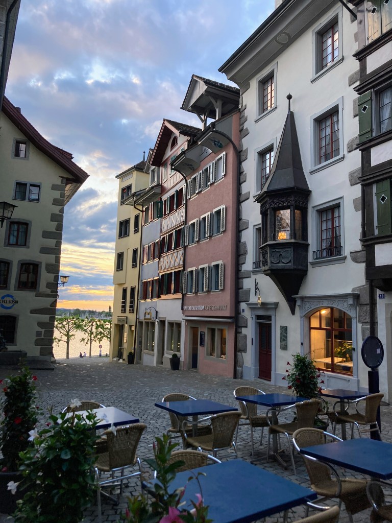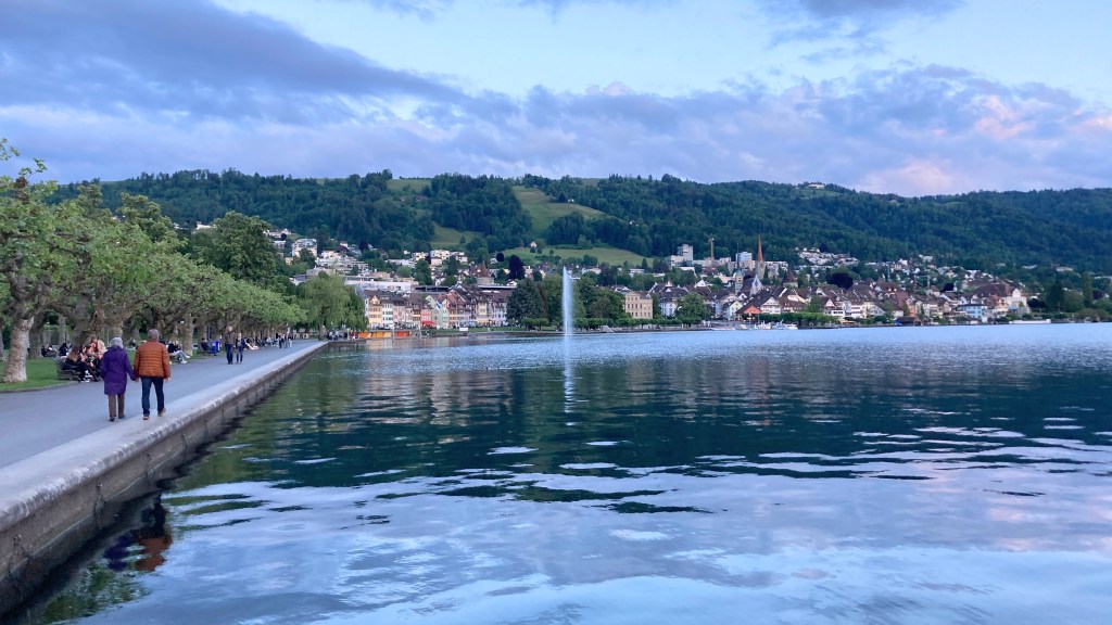 Since the weather had cleared, I found my reserve energy tank and decided to walk along the Zugersee that final night there. The clouds had cleared, and the riverfront was filled with many local families walking their dogs, friends sitting on piers eating pizzas, and local high school students in groups of two to eight laughing and sharing a drink (drinking age is 16 for beer and wine). I was a lone visitor walking by myself it seemed but I loved soaking in the views and listening to the happy conversation around the lake.