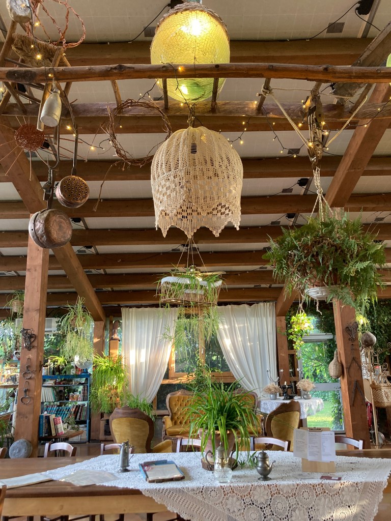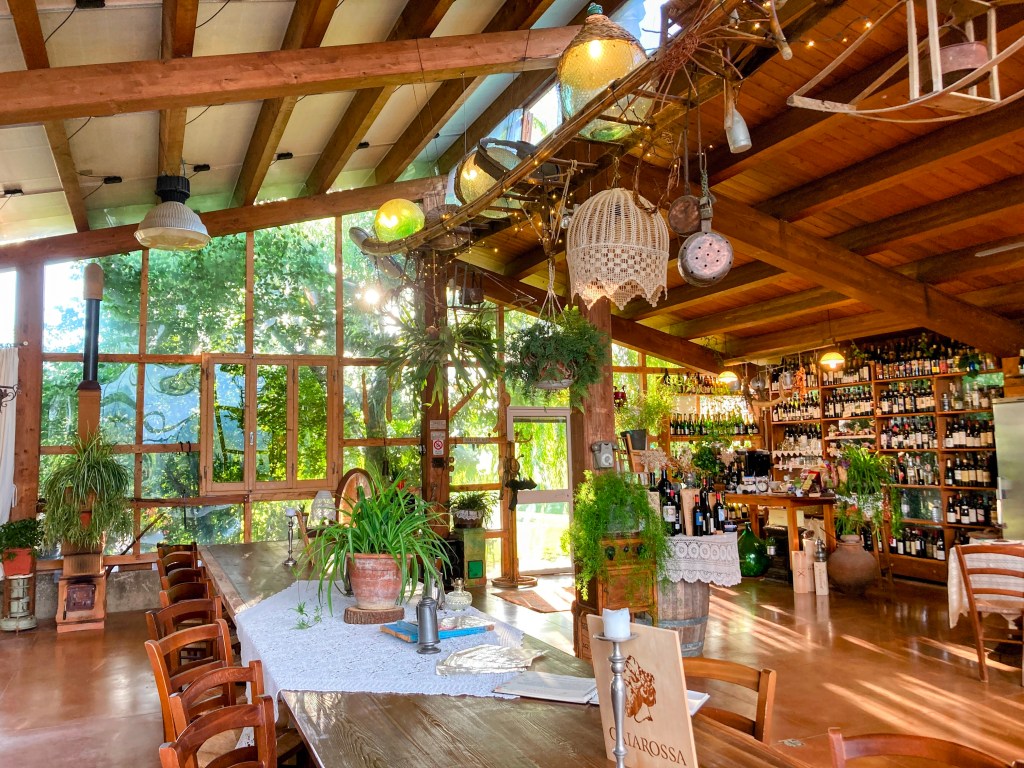 On our first evening at Podere Piandarca, we opted to eat dinner on-site and because of that amazing experience, chose to have dinner there every other night of our stay. It felt so exceptional to have a private home-cooked feast, and to get to do it a few more nights, was not a hard decision to make. Not only the food is a work of art, but the dinner space is a feast for the eyes, located in an old greenhouse filled lovingly with an array of antiques, eclectic furniture, books, plants and glass jugs. Down the center is a long farm table grounding the room with a smaller table near a wall of collected tuscan wine bottles, and on the other side, a pool table and sitting area. Music filled the space and through a side door the staff would magically appear with culinary treat after treat.