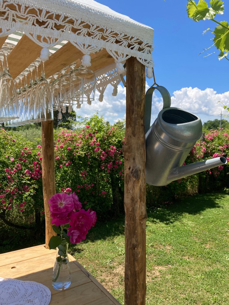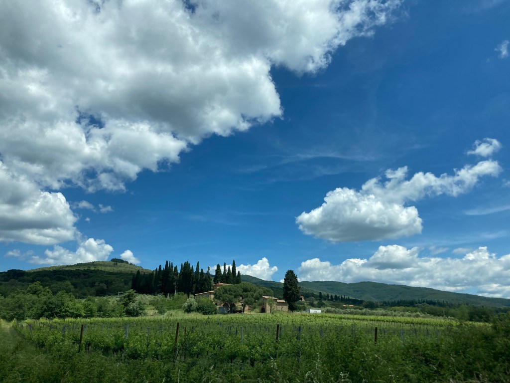 In May 2024, we were the lucky guests at Podere Piandarca. Between the glowing reviews and their ideal proximity to Firenze, we chose it as our home-base for the four days we were in Tuscany. We considered a stay at an agriturismo, and while Podere Piandarca is not an actual working farm, their charming setting among the Tuscan vineyards and their expansive yard filled with flowers and edibles along with the meandering chickens, cats and dog added to the Tuscan farm feel. Also, they had a hilarious drone video on their website at the time and I caught Ryan rewatching it over and over again…these are creative people and we wanted to stay there with them.