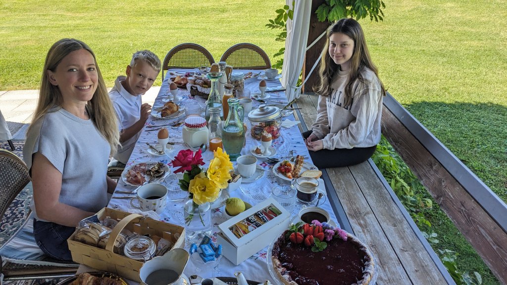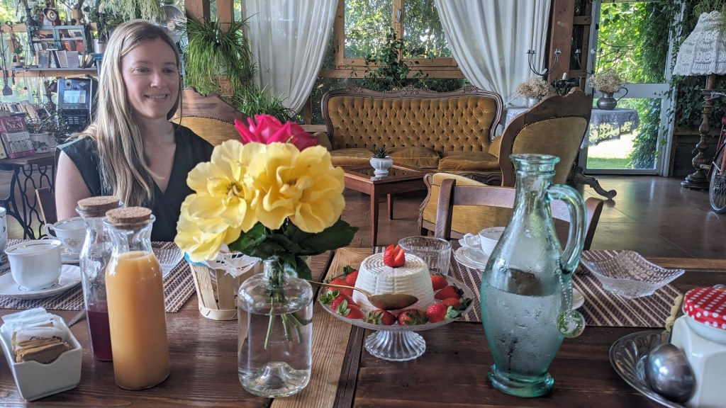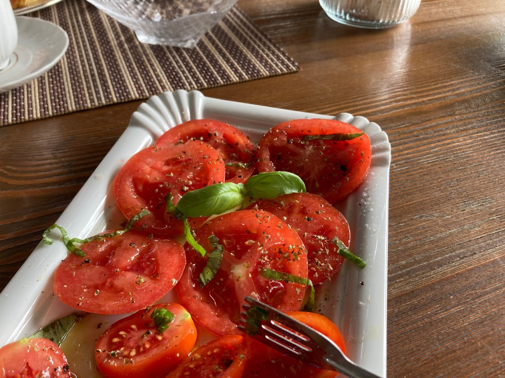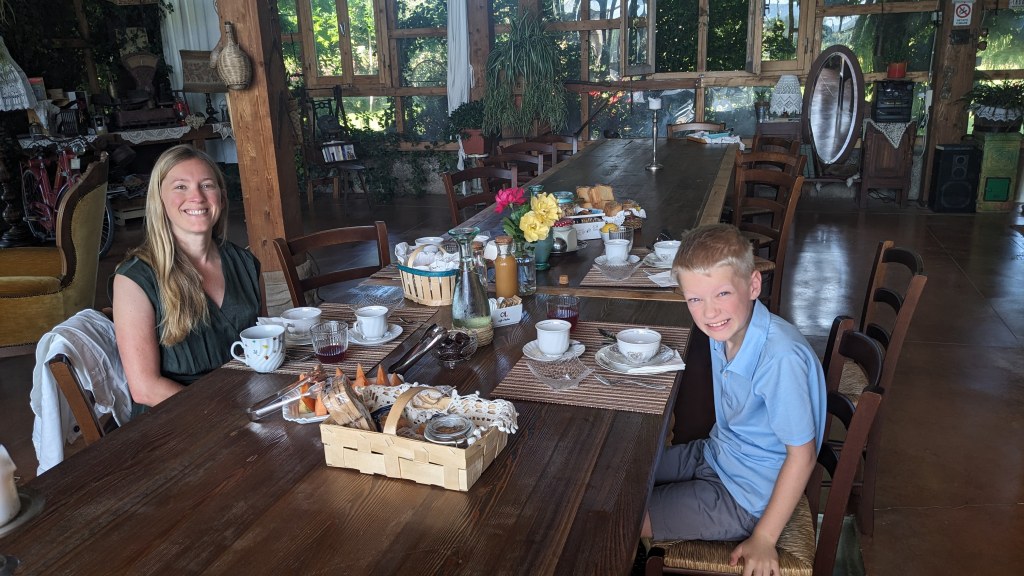 If we had thought dinner was decadent, it was because we hadn’t experienced their breakfast yet. In the morning when we arrived at the table, there was fresh milk, granola, yogurt, bread . . . and that was just the start. Soon, a basket of gluten free breads and croissants (for me), followed by a plate of bacon, a tomato and cheese layered pastry, a strawberry tart, hard boiled eggs, a plate of local salumi, fresh fruit, homemade preserves. I’m certain I’m also forgetting something. Breakfast served also as lunch and afternoon snacks as we were too full to consider lunch and they declared the leftovers ours to take back to our apartment.